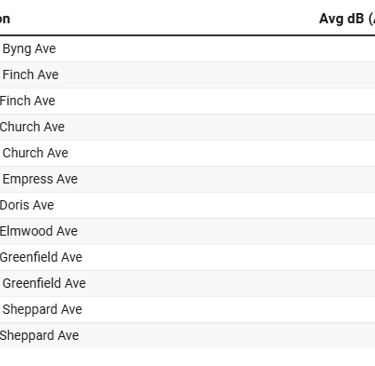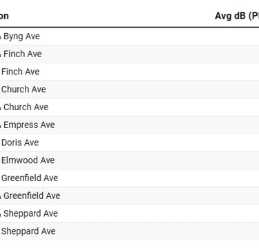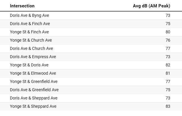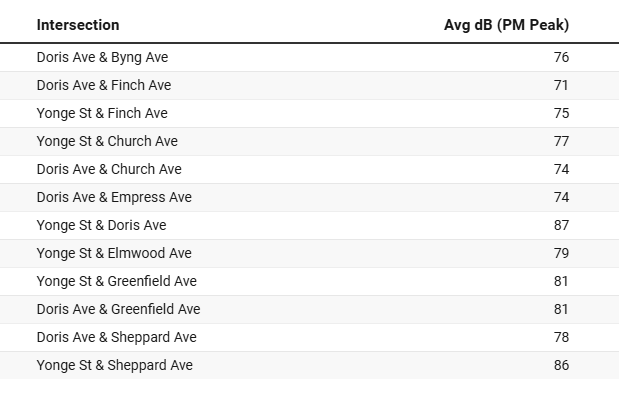 The data collected across twelve intersections in and around the North York Centre Secondary Plan Area shows a consistent presence of elevated noise levels during both AM and PM peak periods. Intersections directly along Yonge Street, particularly at major crossings such as Sheppard, Elmwood, and Doris, recorded the highest average decibel values — often exceeding 80 dB during at least one peak time.