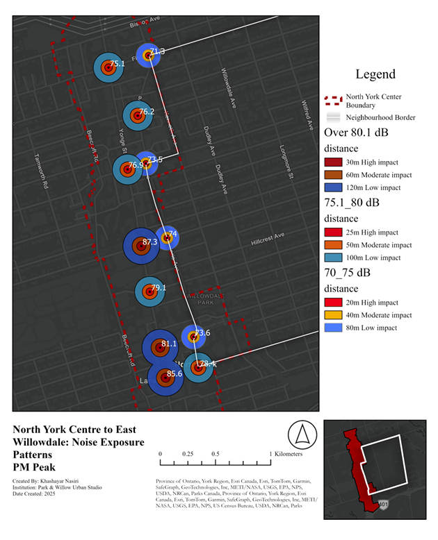 As part of Park & Willow Urban Studio’s ongoing research into livability and environmental comfort in intensifying urban cores, this project examines the potential noise impacts of major intersections located within and near the North York Centre Secondary Plan Area. The aim is to understand how sound generated in this mixed-use, high-density zone may extend into the surrounding neighborhood, particularly East Willowdale.