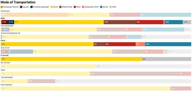 Cycling and walking are still present in the data, but not in the volumes we might expect if amenities were more local and the network more supportive of active travel. While some residents can and do walk to work, school, or errands, this tends to be concentrated in areas near the mixed-use corridors. For many others, the distances, disconnected street grid, and lack of intermediate destinations make these trips impractical without a vehicle.