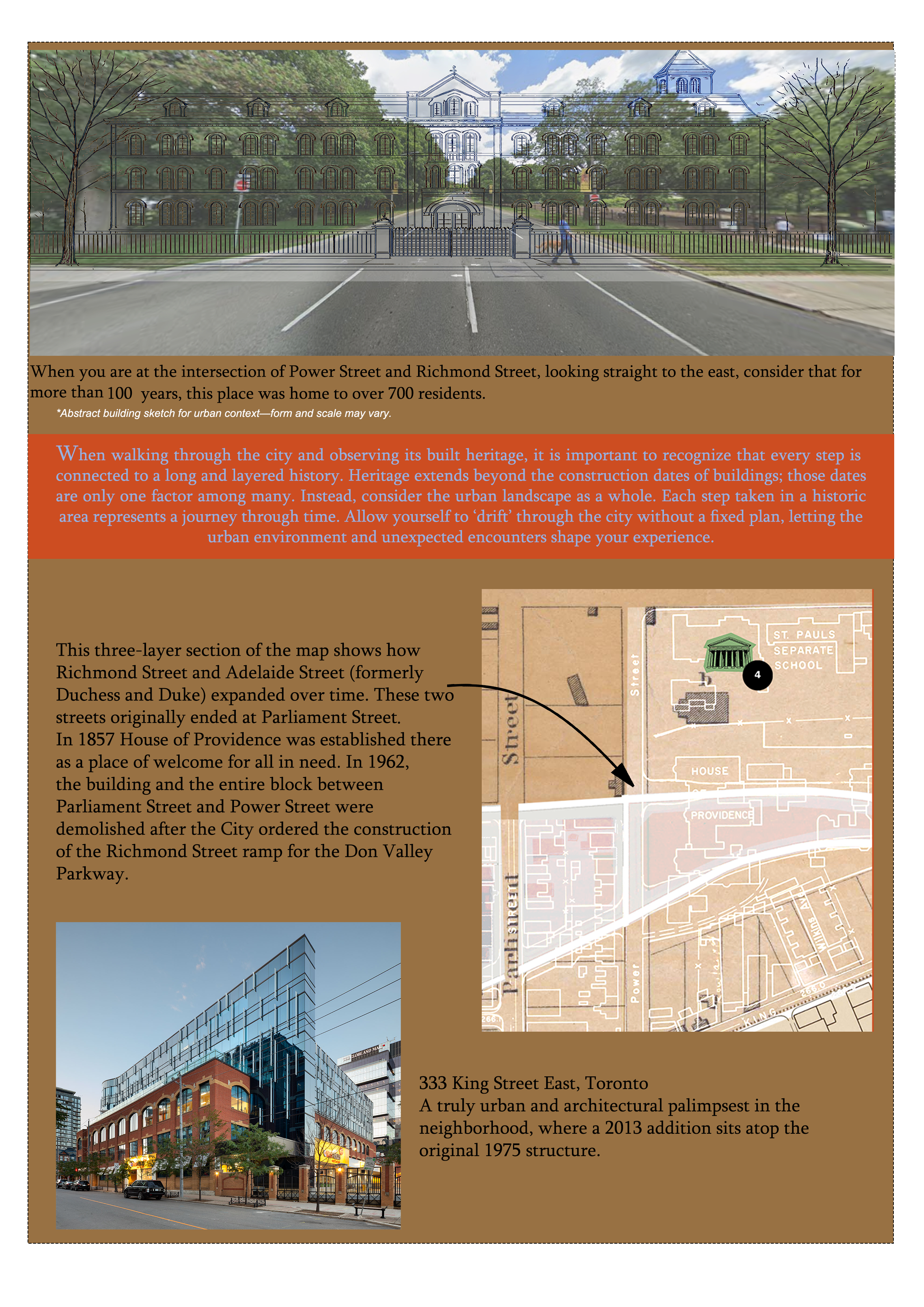 Here, I wanted to apply the concept of the 'Urban Drift'—exploring without a fixed plan to let the environment reveal itself. You can see how the city’s infrastructure literally erased history here. The House of Providence stood at the end of Richmond and Adelaide (formerly Duchess and Duke) for over a century, welcoming those in need. But in 1962, the entire block was demolished to build the Richmond Street ramp for the Don Valley Parkway. I also highlighted 333 King Street East as a counter-example: a modern 'architectural palimpsest' where a 2013 addition sits right on top of a 1975 structure, showing how we can build with the past instead of just paving over it.
