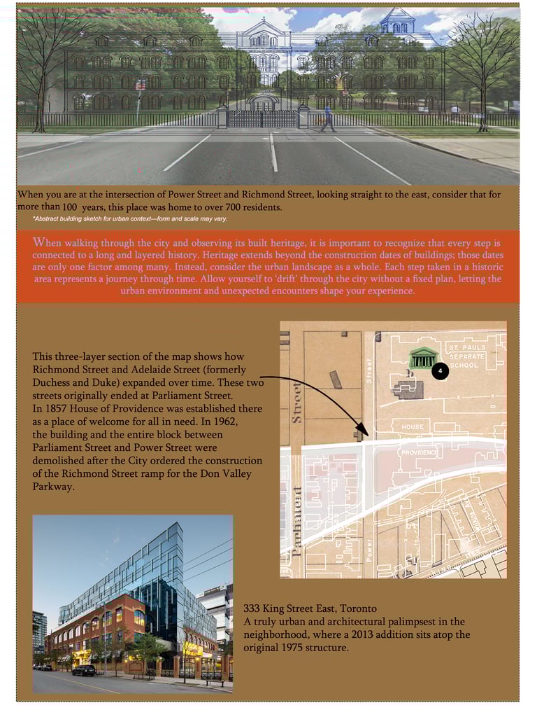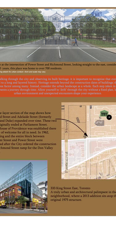 Here, I wanted to apply the concept of the 'Urban Drift' exploring without a fixed plan to let the environment reveal itself. You can see how the city’s infrastructure literally erased history here. The House of Providence stood at the end of Richmond and Adelaide (formerly Duchess and Duke) for over a century, welcoming those in need. But in 1962, the entire block was demolished to build the Richmond Street ramp for the Don Valley Parkway. I also highlighted 333 King Street East as a counter-example: a modern 'architectural palimpsest' where a 2013 addition sits right on top of a 1975 structure, showing how we can build with the past instead of just paving over it.