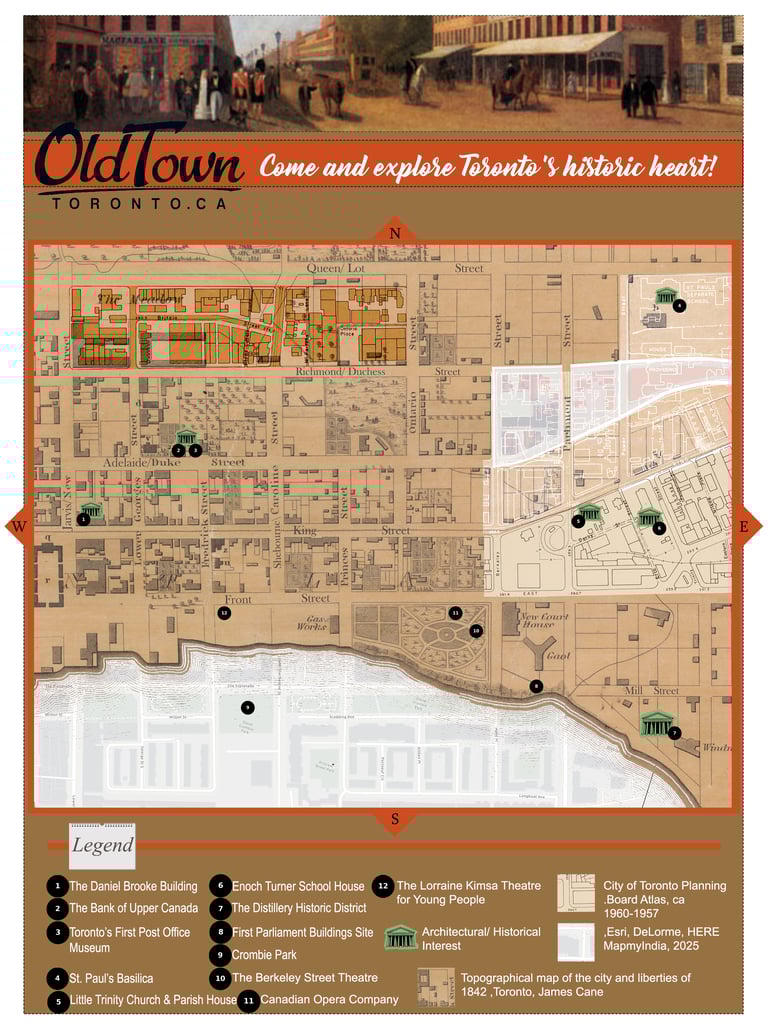 This map isn’t just a snapshot of today; it’s a composite of three different eras. I overlaid the 1842 topographical map and the 1957 Planning Board Atlas onto the modern 2025 street grid. With a heritage map like this, you can navigate using the old names of the streets, like seeing where Duke and Duchess became Adelaide and Richmond, and see how the City has expanded through time. The highlighted zones reveal how the shape of the streets has changed and where historic 'ghosts' intersect with the Toronto we walk through today.
