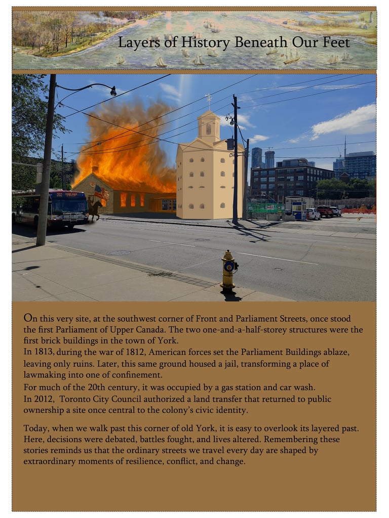 Image 3 (Parliament): A visual overlay at Front and Parliament Streets, combining a modern photo with an illustration of the first Parliament buildings burning during the War of 1812, created by Armin Jahromi in Sept. 2025